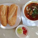 ម្ហូបវៀតណាមដែលមានបាញ់ហយ ហើយមានសាច់ សៃយ៉ និងបន្លែនៅពីលើ