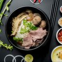 Vietnamese-inspired noodle soup featuring tender Hong Kong chicken, fragrant herbs, and a savory broth that's perfect for a satisfying meal (For ref only)