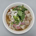 ទឹកស៊ុបមានរសជាតិឆ្ងាញ់ចាក់លើគុយទាវបន្លែនិងសាច់បាងនិងប្រហិតសាច់គោ