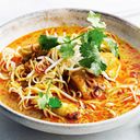 បំរែបំរួលនៃ ឡាក់សា ជាមួយនឹងបំណែកសាច់មាន់ទន់ៗ បម្រើក្នុងទឹកស៊ុបដូងដែលមានរសជាតិហឹរ