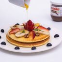 Fluffy pancakrs stacked and served with a medley of fresh seasonal fruits, drizzled with maple syrup, honey or chocolate nutella