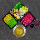 សាច់គោស្រស់ សាច់គោស្រួយ ប្រហិតថៃ ពោតហាវៃ កូនស្ពៃ ស កូនស្ពៃខៀវ ផ្សិតម្ជុល ផ្សិតក្តាមខ្មៅ មីលឿង មីខៀវ ទឹកជ្រលក់ ពងមាន់ ទឹកស៊ុប